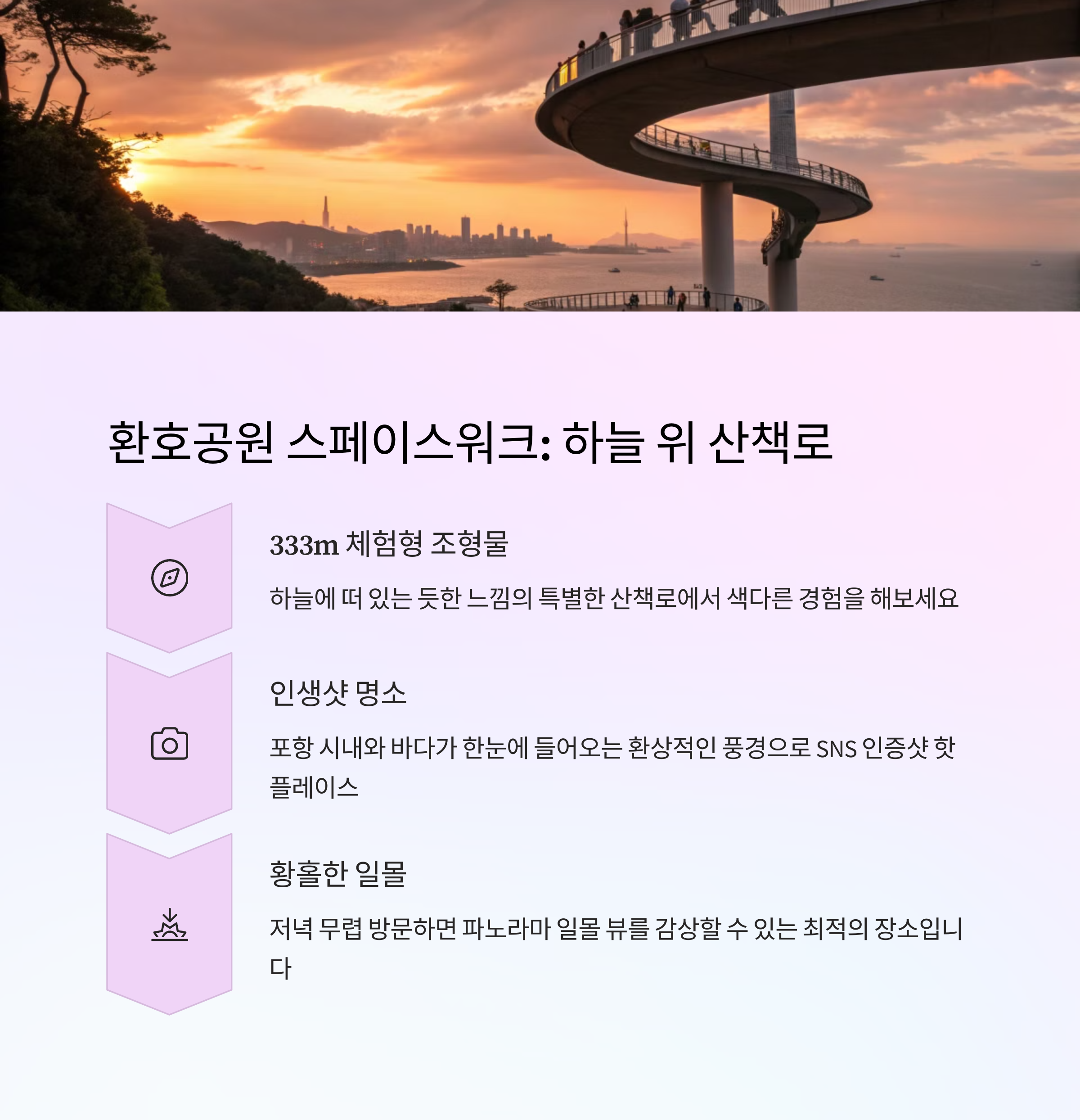환호공원에 위치한 스페이스워크는 국내 최대 규모의 조형물로, 포항의 특별한 뷰를 감상할 수 있는 멋진 장소입니다.