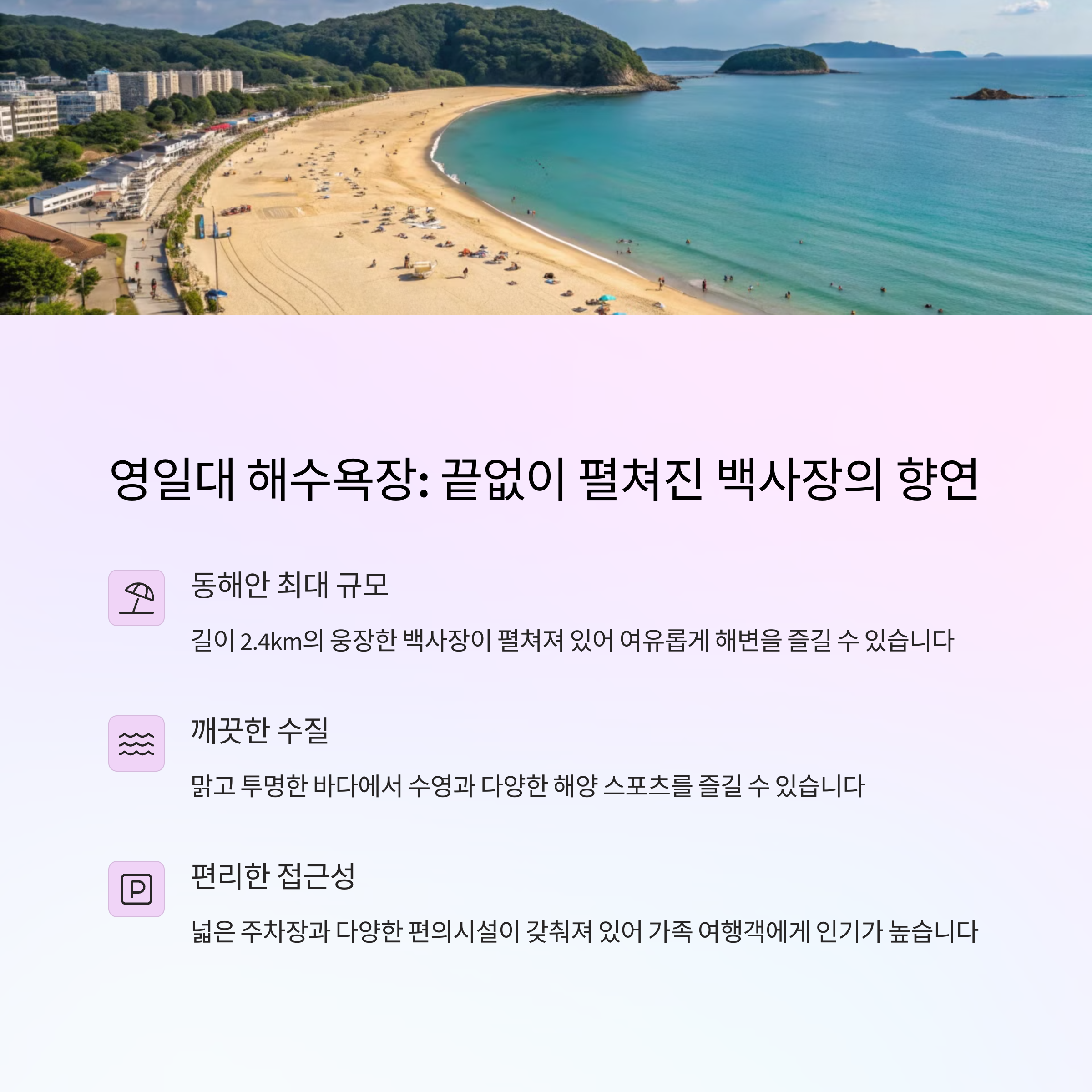 넓은 백사장과 깨끗한 해변, 그리고 주변에 펼쳐진 다양한 편의시설 덕분에 여름철 피서지로 특히 유명하죠.