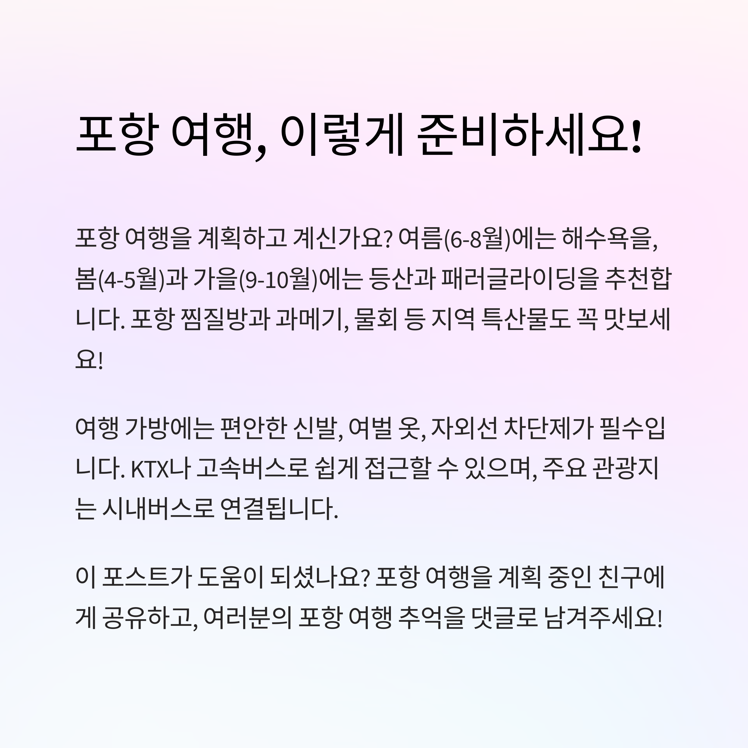 포항은 사계절 내내 다양한 매력을 느낄 수 있는 도시로, 자연과 활동의 조화를 경험할 수 있는 완벽한 여행지입니다. 이번 추천 코스를 참고해 여유롭고 즐거운 여행을 경험해 보세요. 다음 여행지에서 만나요! 😊