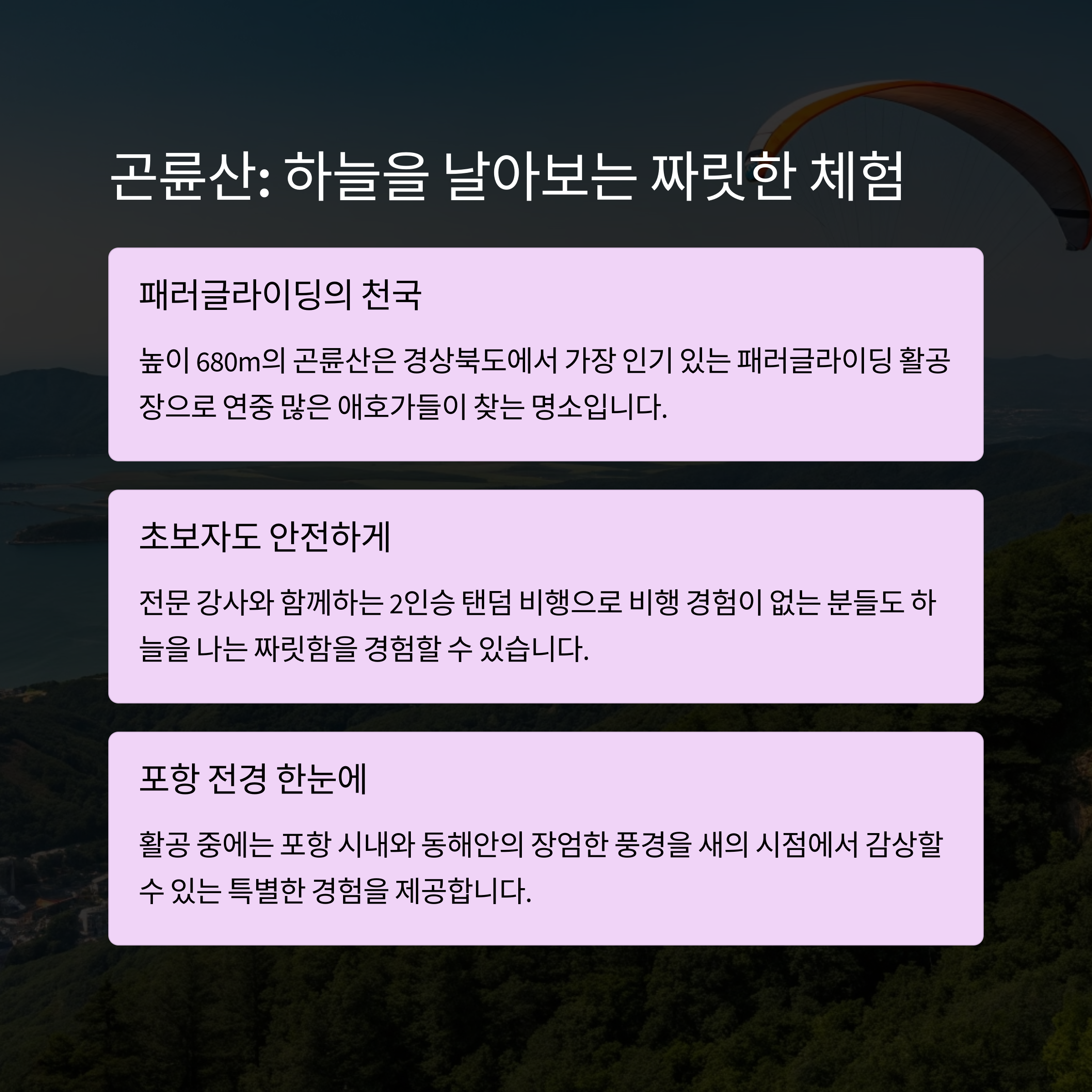자연을 직접 느끼며 하늘에서 바다를 조망해보고 싶으시다면, 곤륜산 패러글라이딩 활공장을 추천해요.