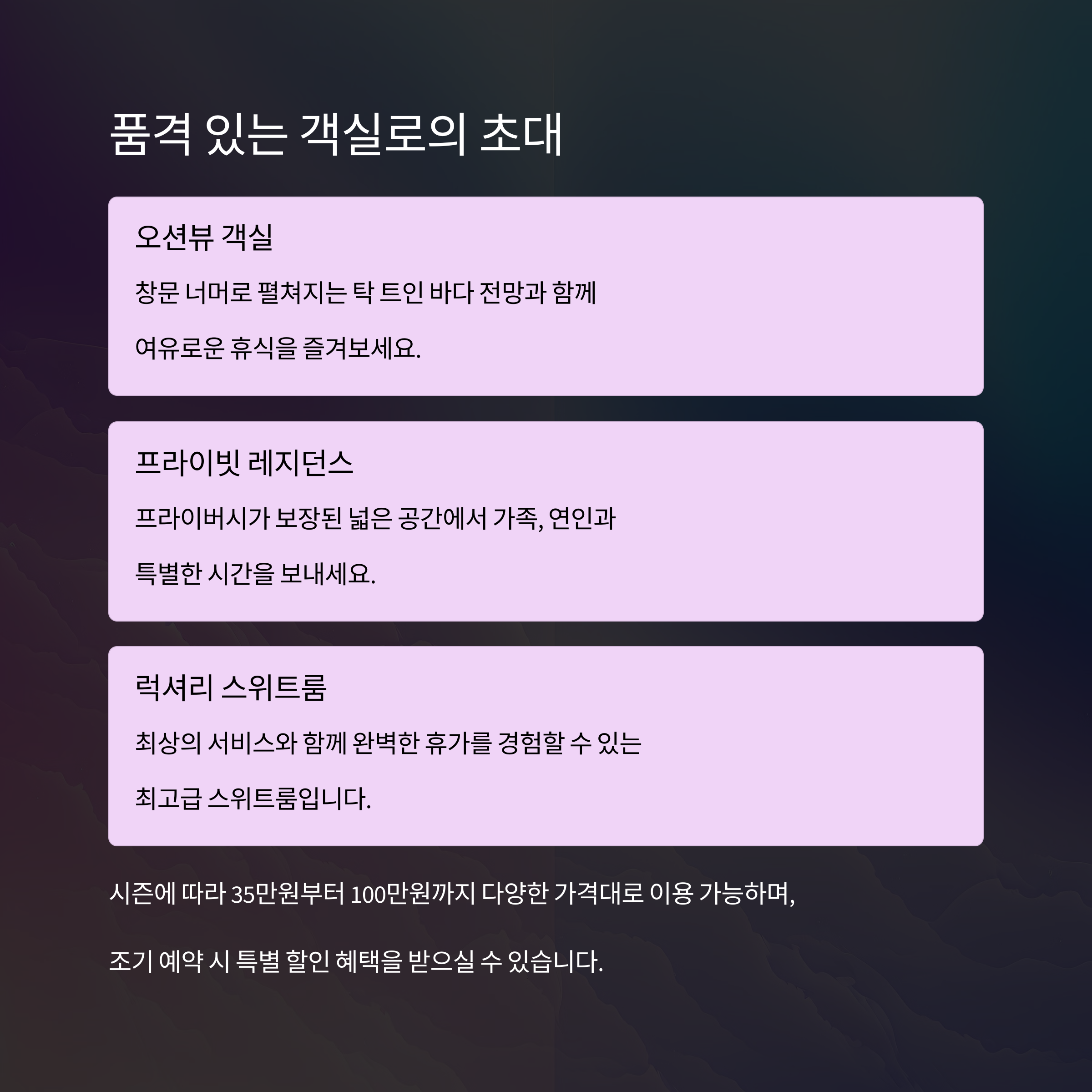 그중 가장 인기 있는 옵션은 프리미엄 오션뷰와 프라이빗 레지던스입니다.