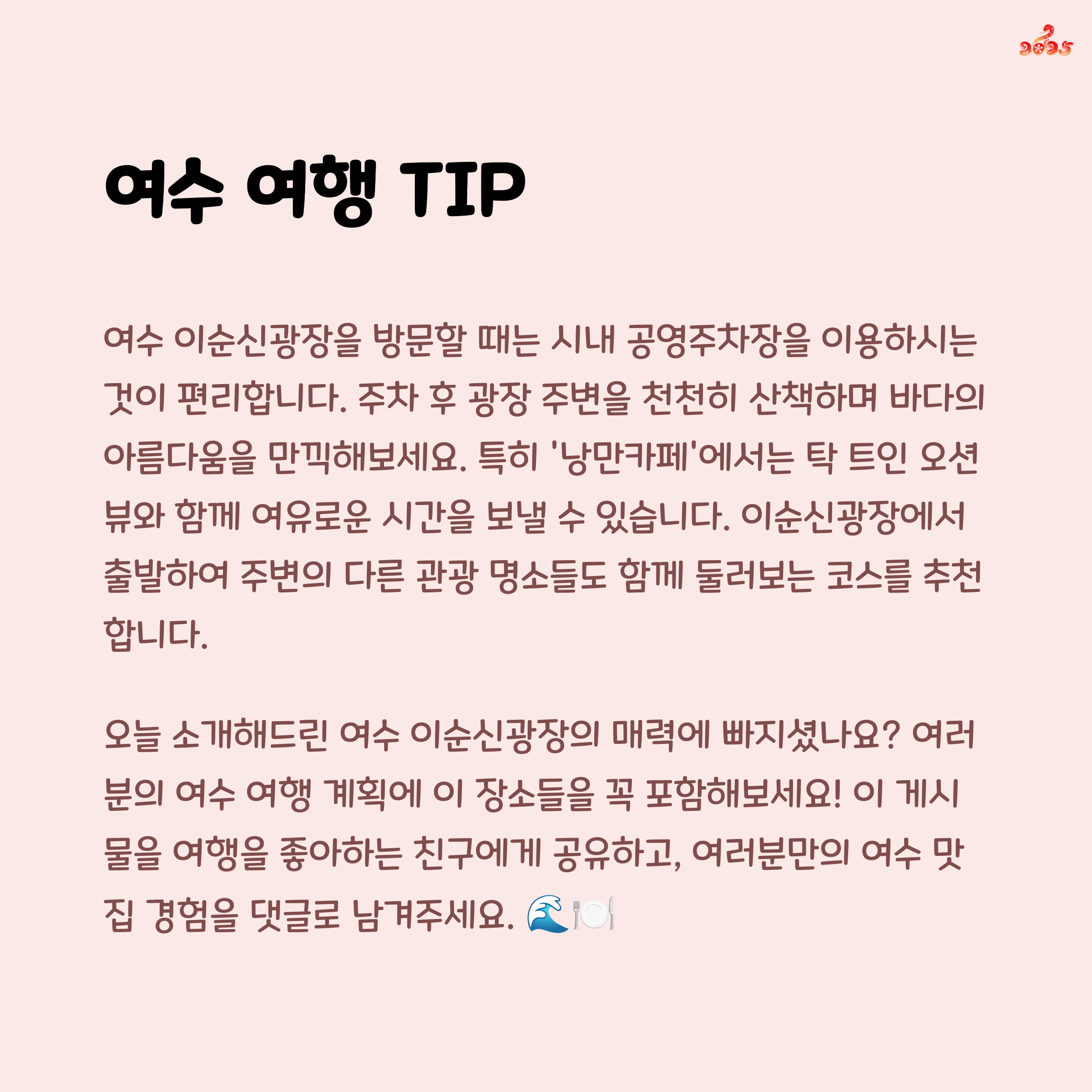 여수 이순신광장은 단순한 관광지가 아니라, 다양한 맛집과 독특한 기념품으로 이색적인 즐거움을 선사합니다. 역사의 흔적을 느낄 수 있는 이곳에서, 맛과 경치를 모두 즐기며 특별한 여행의 추억을 만들어보세요. 여수가 자랑하는 풍경과 미식으로 가득 찬 하루를 보내시길 바랍니다!