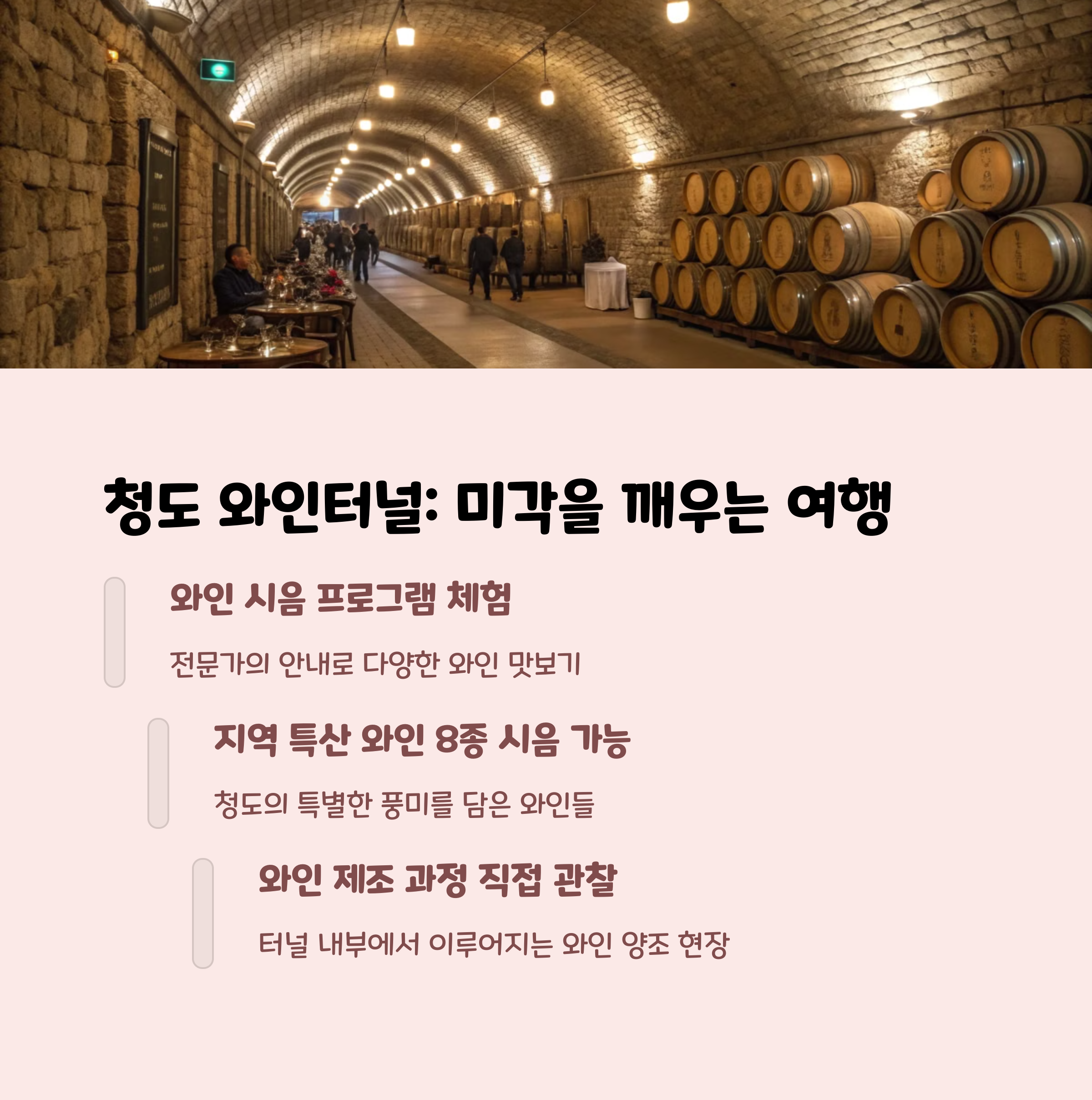 터널 안에서 와인 역사와 제조 과정을 배우고 시음도 즐길 수 있답니다.