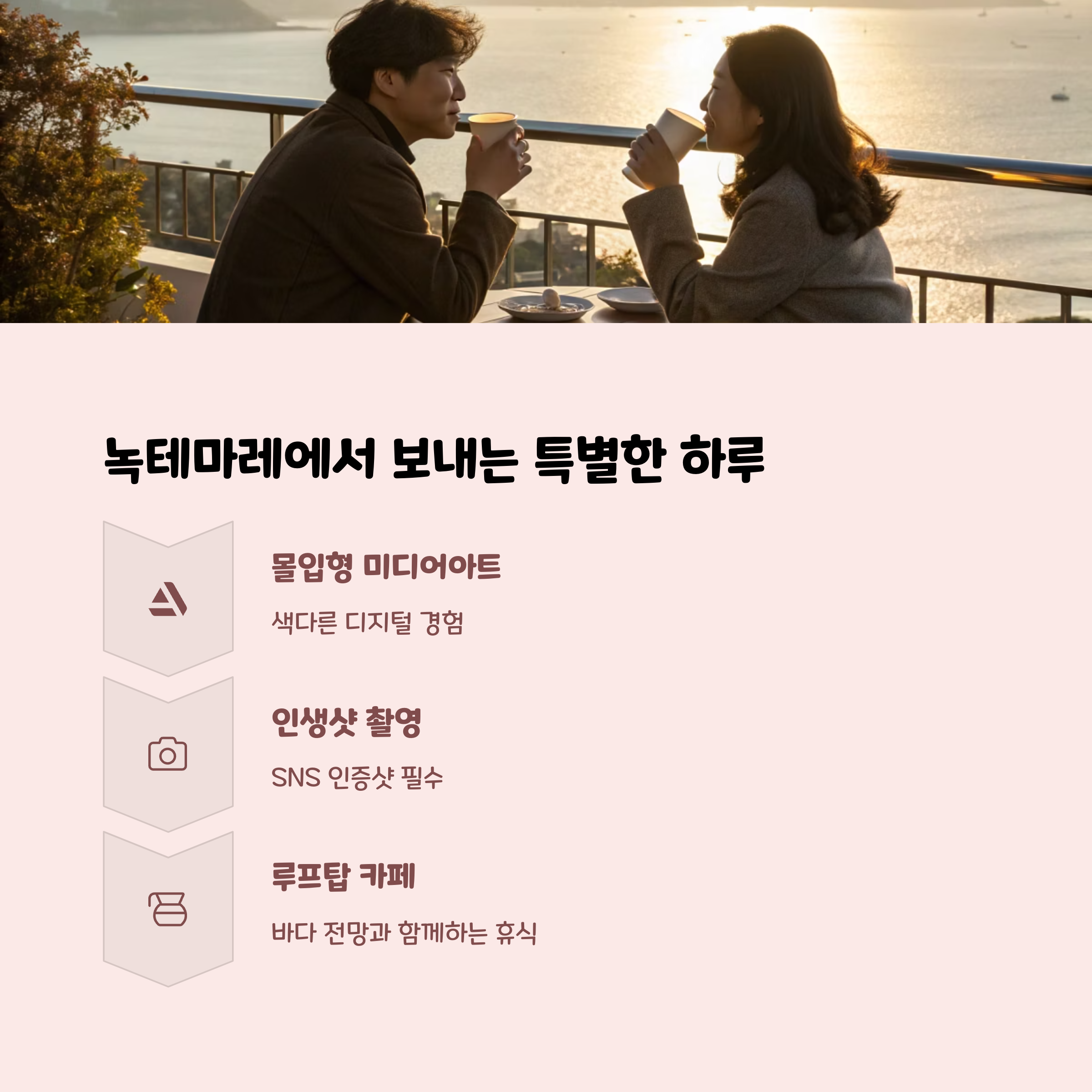 여수는 실내에서도 다양한 즐거움으로 가득 차 있는 도시입니다. 특별히 추천드린 녹테마레는 여유롭고 창의적인 데이트에 딱 맞는 장소에요.