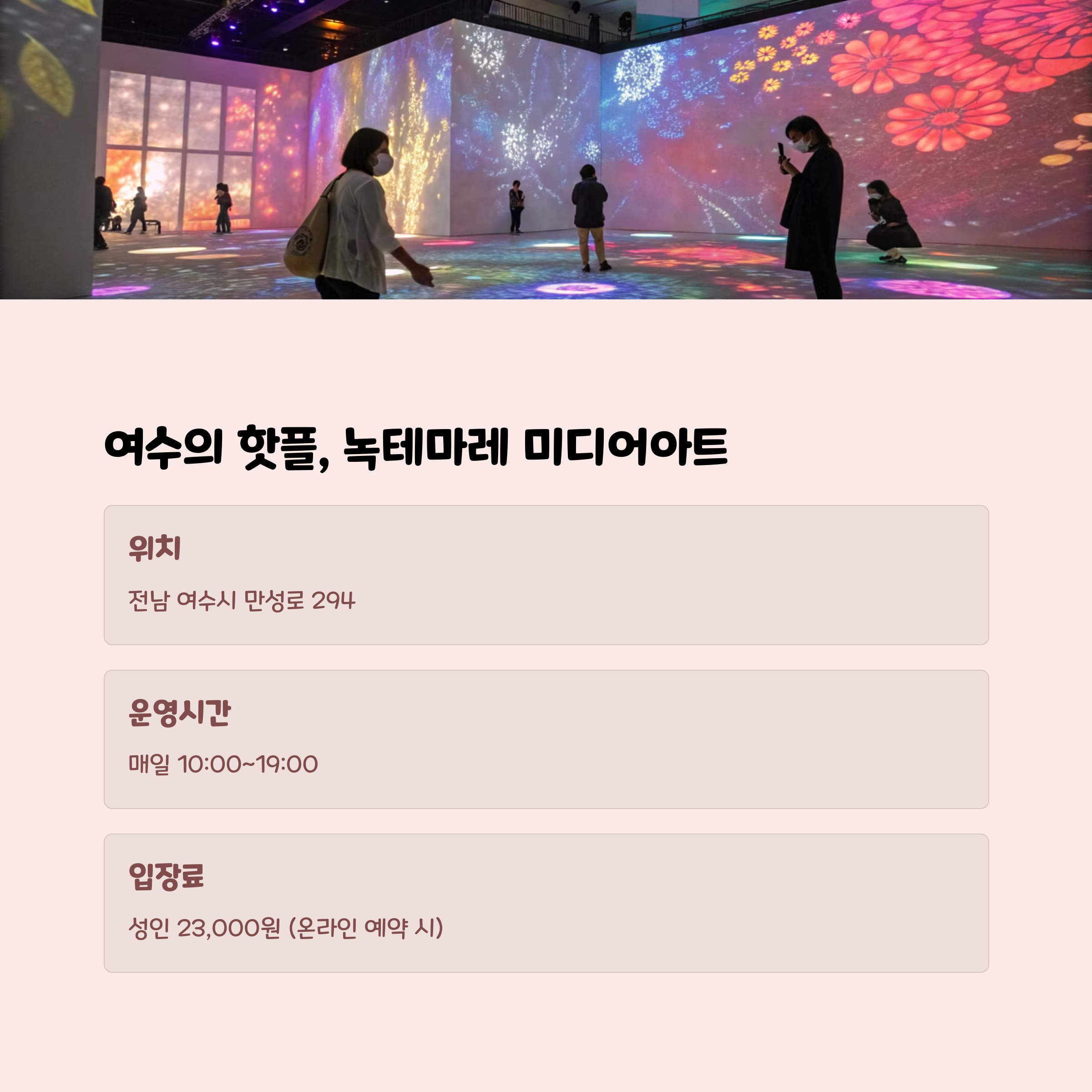 여수는 실내와 실외를 넘나드는 다채로운 매력으로 여행자들의 사랑을 받고 있습니다. 특히, 녹테마레 미디어아트와 같은 현대미술과 기술이 접목된 체험은 연인, 가족, 친구들과 특별한 시간을 보내기에 안성맞춤입니다. 이번 여수 여행이 더욱 풍성하고 특별할 수 있도록 위 추천 장소들을 활용해보세요! 잊지 못할 추억이 여러분을 기다리고 있습니다.