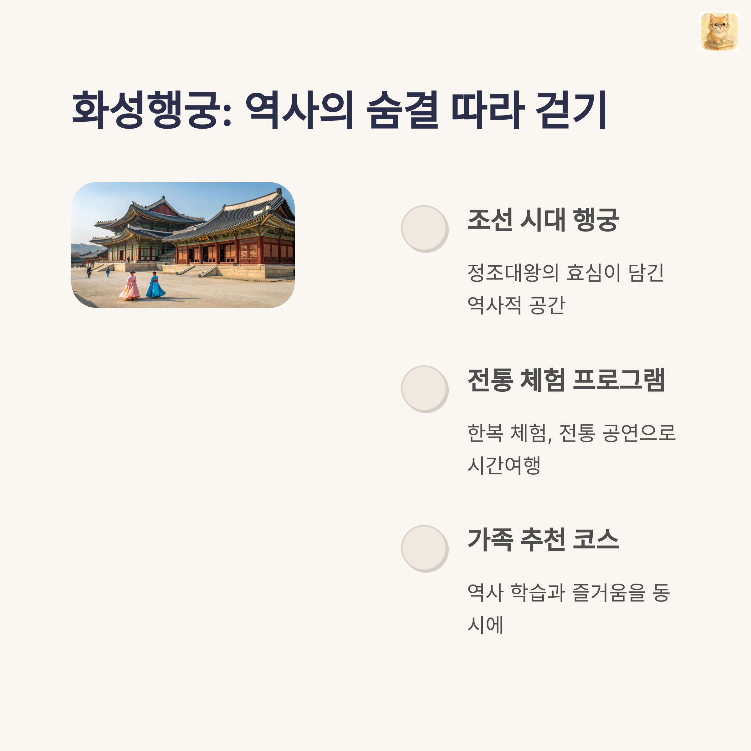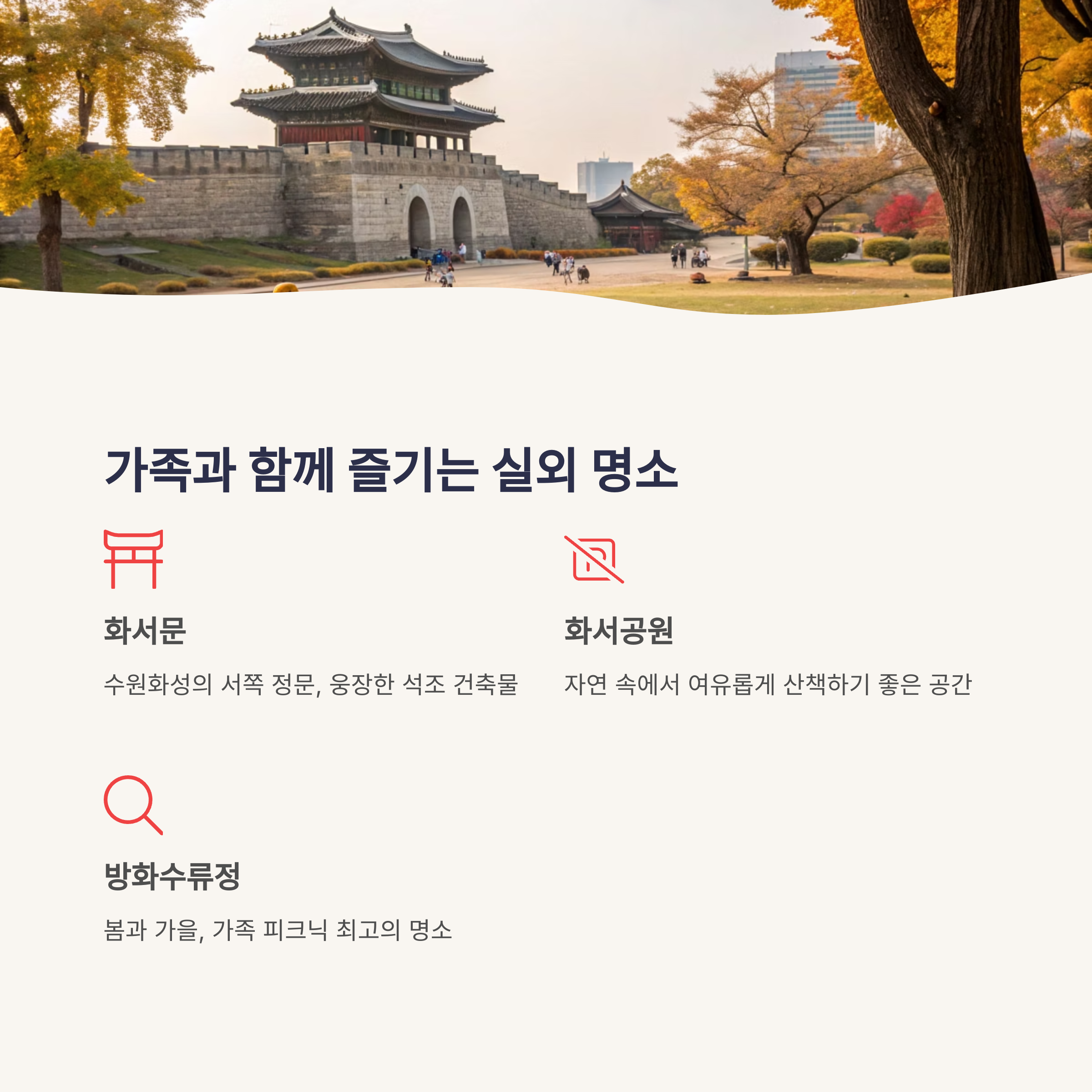 특히 가을 단풍이 아름다운 화서문과 화서공원은 가족과 함께 산책하기 좋은 곳이에요.
