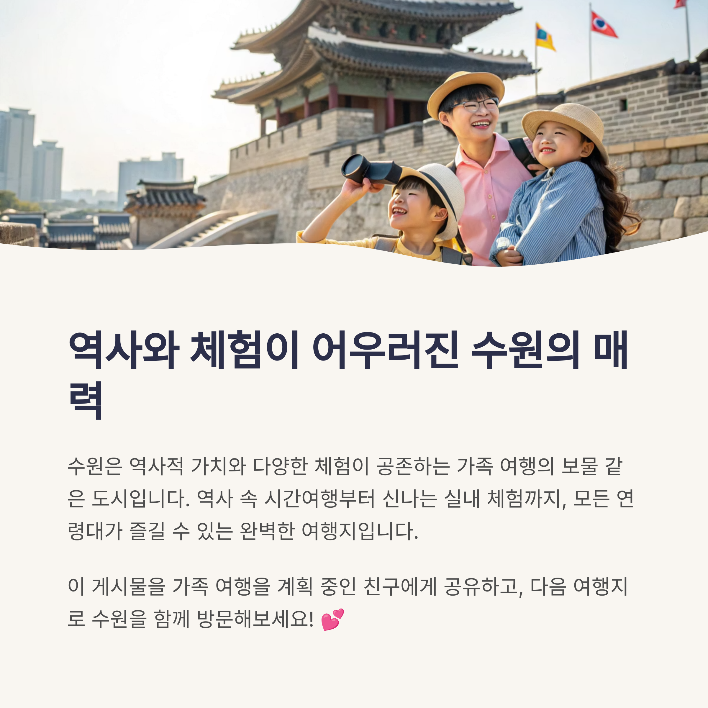 오늘은 수원에서 아이와 함께 즐길 수 있는 다양한 명소들을 소개해드렸습니다.