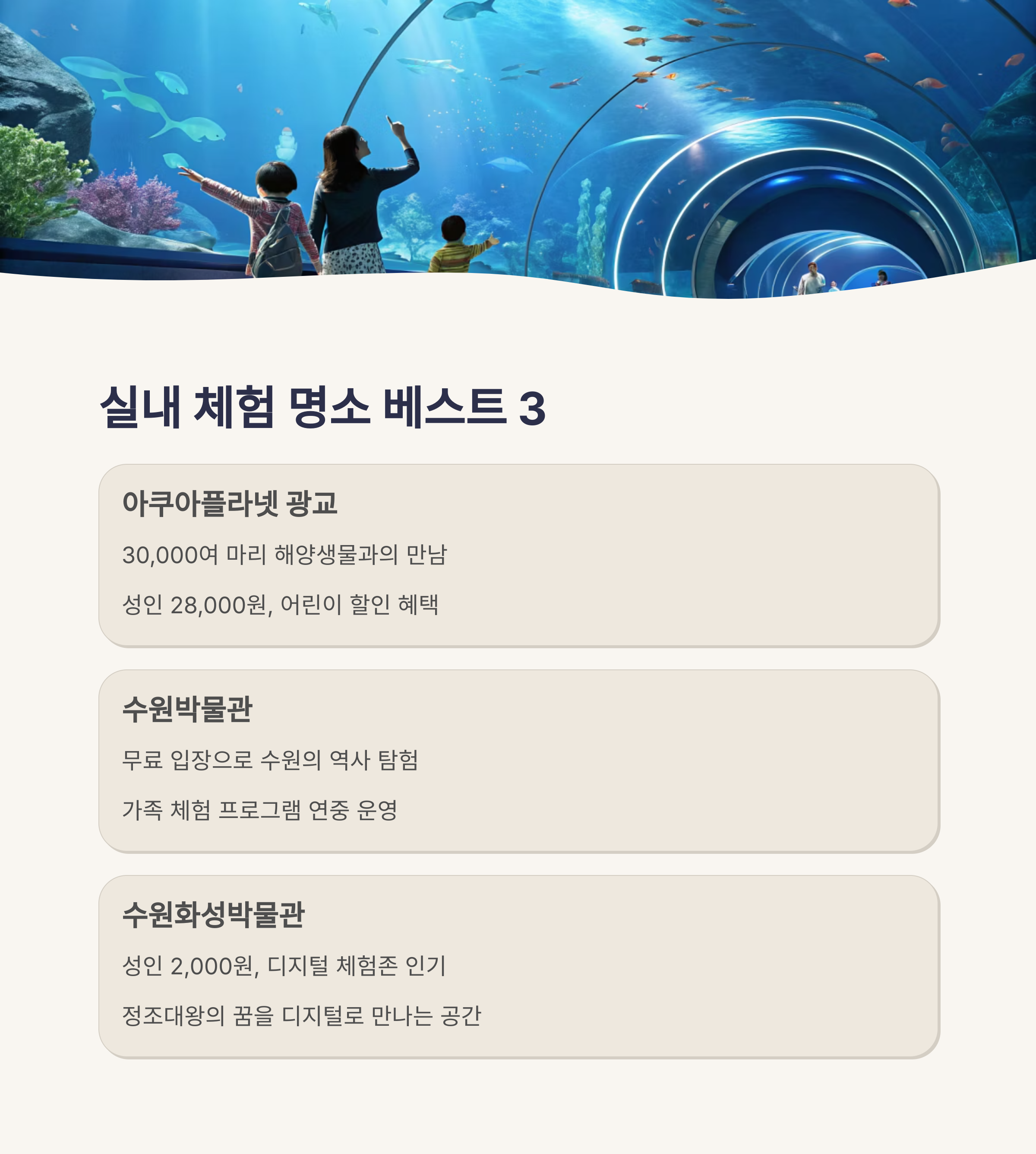 수원은 날씨에 구애받지 않고 즐길 수 있는 실내 명소들도 많습니다.