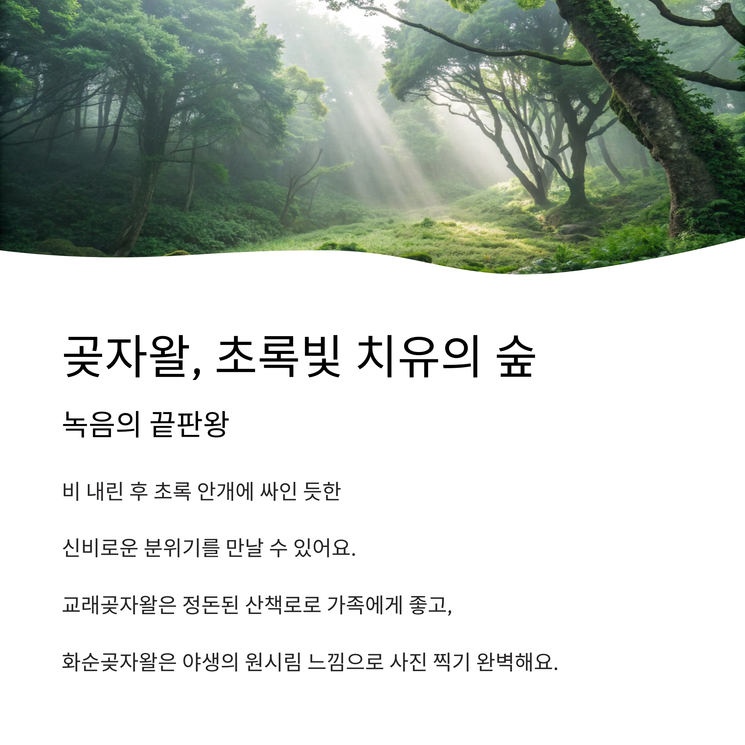 | 교래곶자왈 | 정돈된 산책로 | 아이 동반 가족에 적합 |