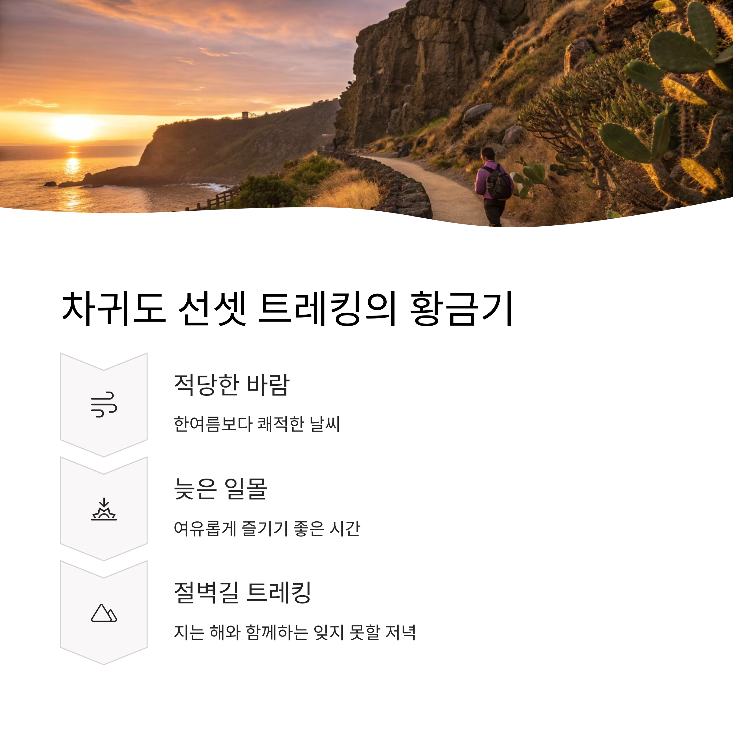 "지는 해와 함께 걷는 절벽길, 잊을 수 없는 제주 저녁이 됩니다"